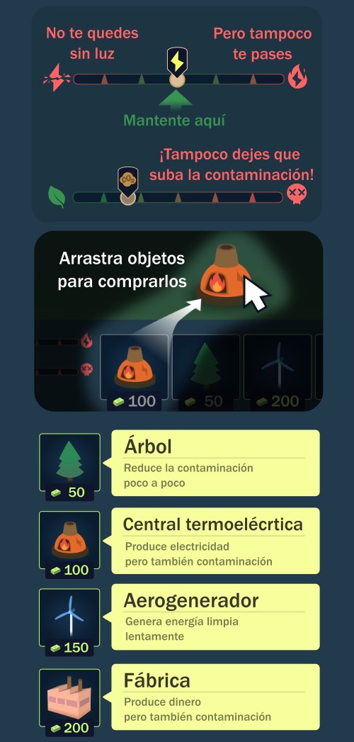 - Sostenibilidad porque el juego trata de conseguir energía para un pueblo, sin contaminarlo, y usando energías renovables.